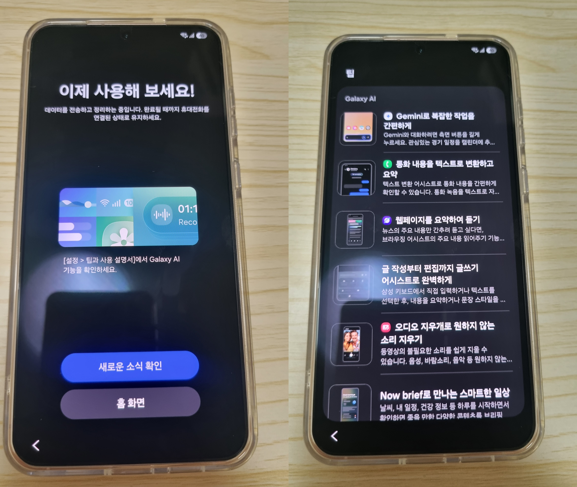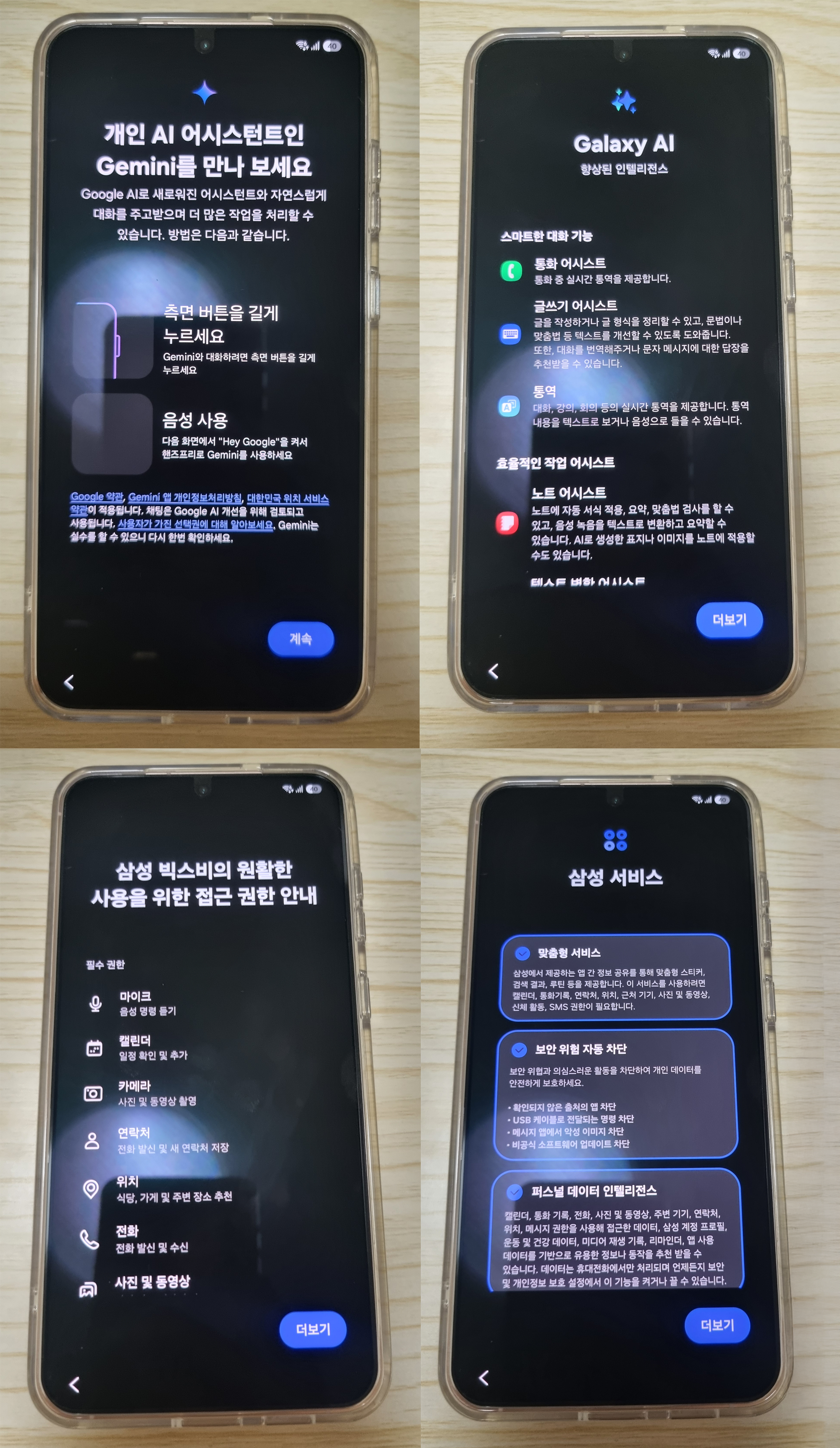 데이터 이전 후 지문등록이나 기본적인 세팅 과정이 이어졌습니다. 이후로 제미나이(Gemini) 세팅과 Galaxy AI 소개 등의 안내가 이어진 후 초기 세팅이 마무리 된거 같습니다.