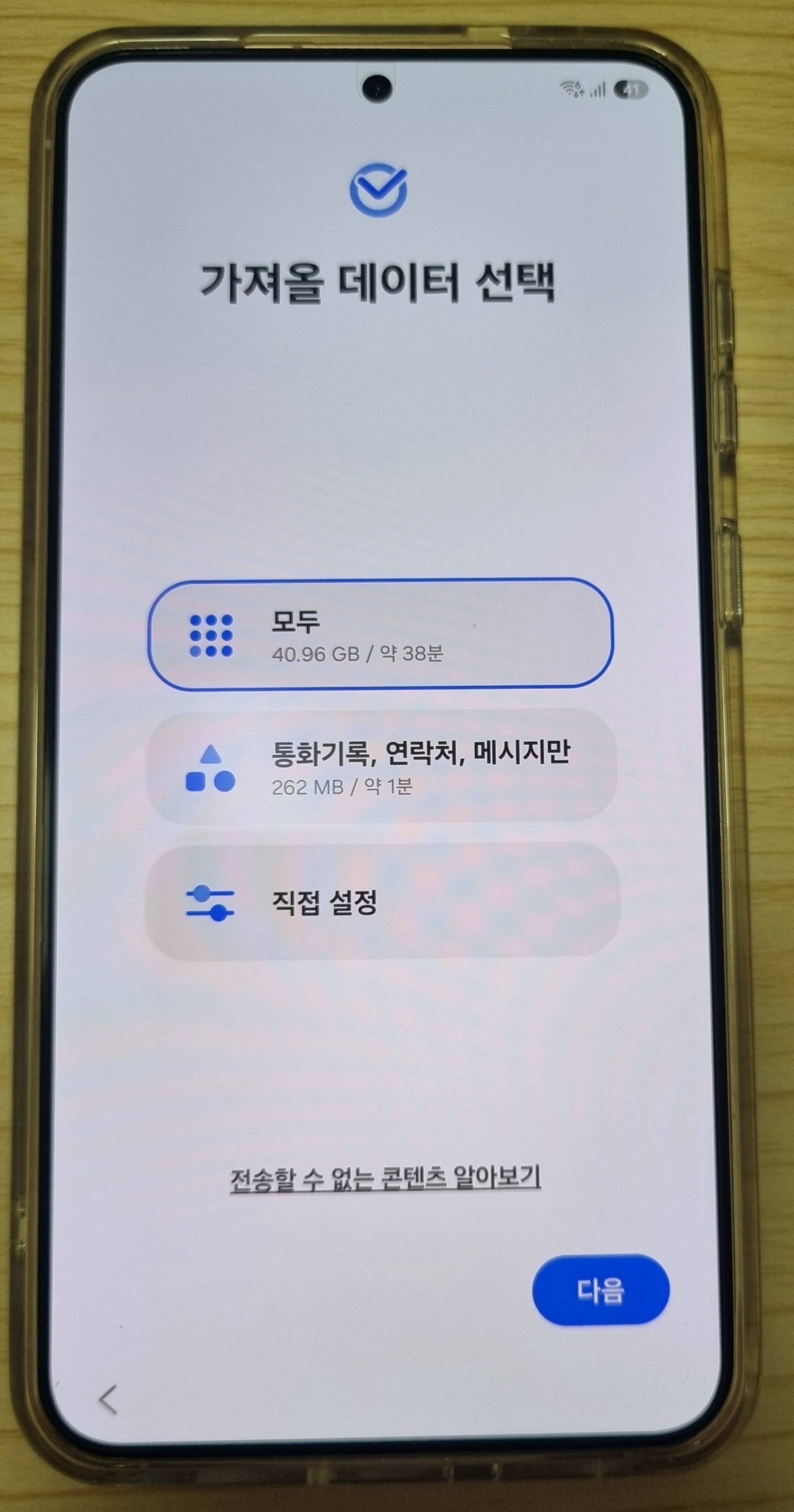 기존 사용하던 S21은 128GB 모델이었으나, 시스템 영역을 제외하면 실제 옮겨질 데이터는 모두를 선택해도 약 41GB 정도로 38분 정도면 이전이 완료되는 것 같았습니다.
