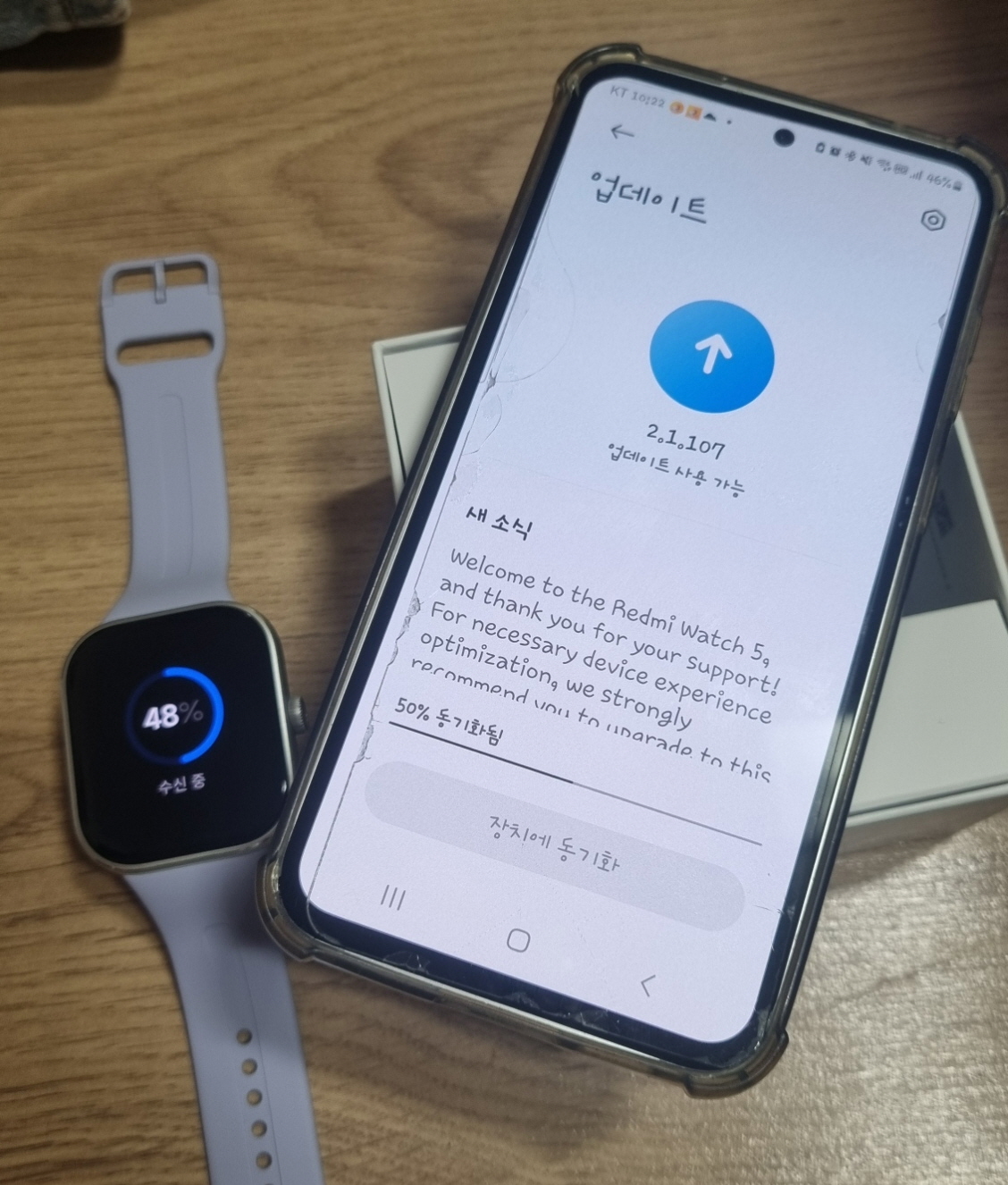 다운로드하면서 바로 워치로 동기화되는데 속도가 꽤 빠르게 전송이 되는 거 같습니다. 핸드폰이 50%인데 워치도 48%까지 진행이 되고 있습니다.