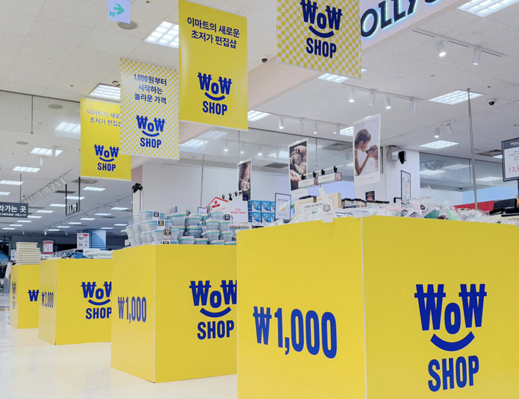 이마트의 '와우샵(WOW SHOP)'은 대형마트의 유통 노하우를 집약시킨 초저가 라이프스타일 브랜드입니다.