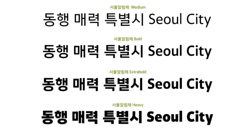 서울알림체는 총 4종(Medium, Bold, Extra Bold, Heavy)으로 구성되어 있으며, 누구나 무료로 다운로드하여 사용할 수 있습니다.