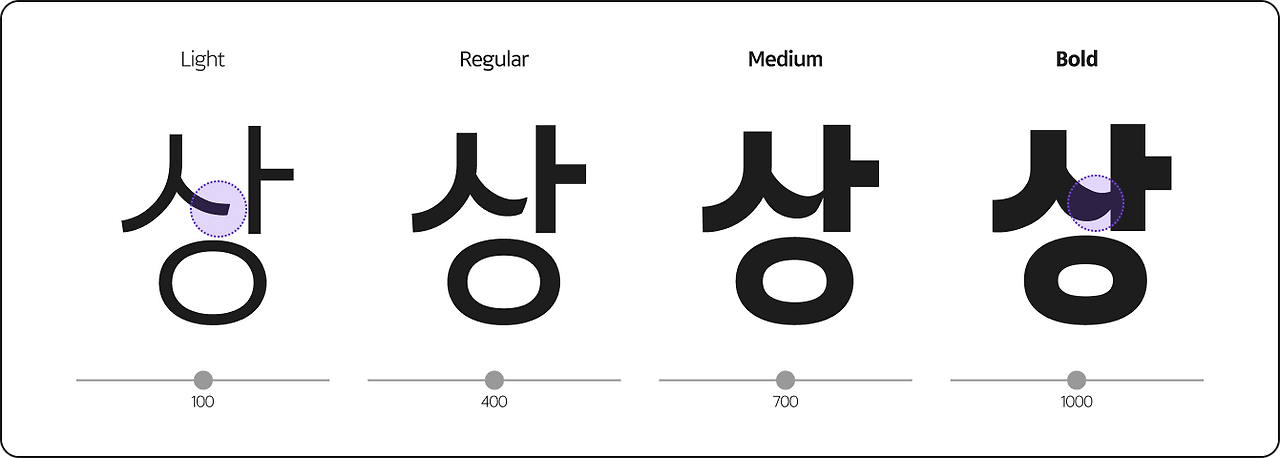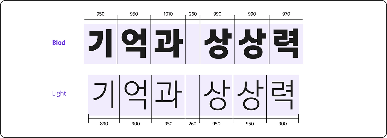 Bold는 탄력적인 곡선 획을 통해 긍정적이고 활동적인 인상을, Light는 보다 정제된 형태로 안정적인 가독성을 보여줍니다.