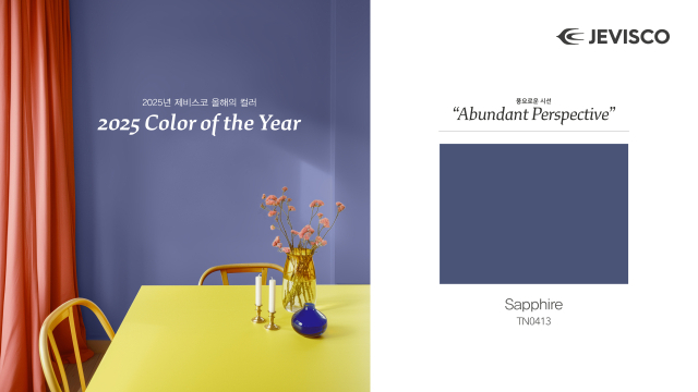 컬러의 메인 테마인 '풍요로운 시선(Abundant Perspective)'은 미래를 바라보는 우리의 관점을 더욱 새롭게 하고 더 나은 선택과 가치 있는 라이프스타일을 완성해 주며 사파이어(Sapphire)와 함께 제안된 다채로운 컬러 팔레트로 우리의 삶을 조화롭고 세련된 공간으로 완성할 수 있습니다.
