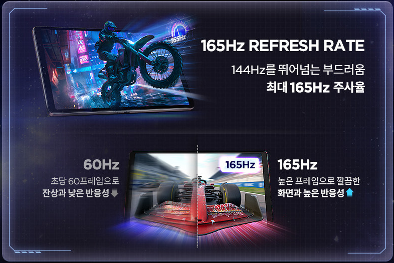 - 스마트 주사율 기능: 상황에 맞게 120Hz~165Hz 자동 조절