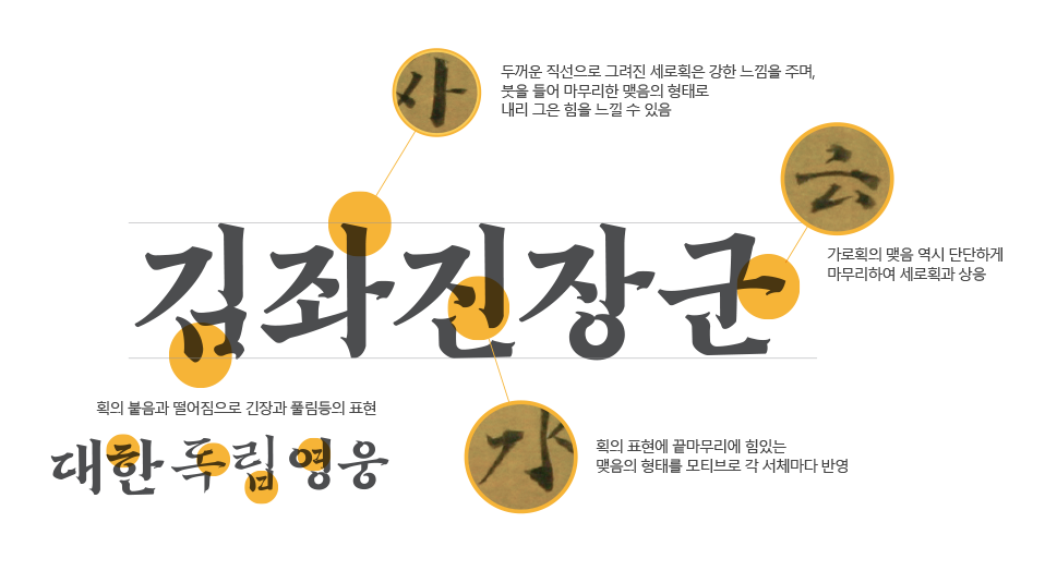 획과 글자 자체의 형태에 집중하여 붓의 질감과 흐름을 충실히 표현하였고, 자소의 굵기와 밀도를 다르게 하여 서체의 무게감과 시각적 안정감이 느껴지도록 하였다.