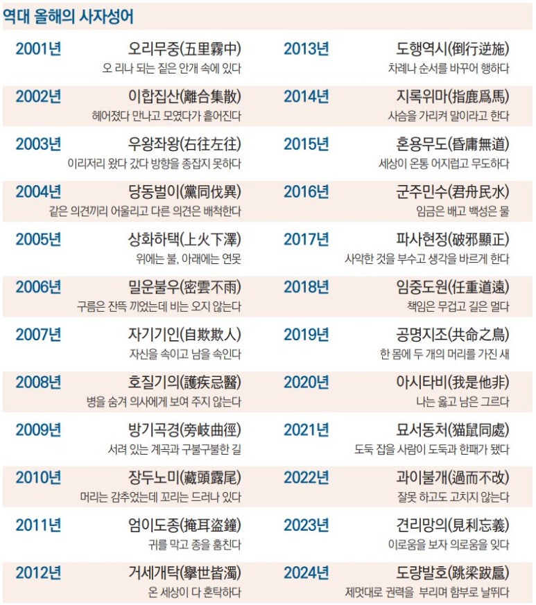 앞으로는 조금 더 희망찬 의미가 담긴 사자성어가 더 많이 선정되길 기원해 봅니다.