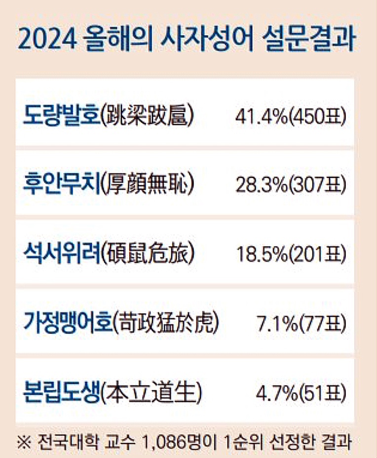 참고로 이번 사자성어 선정은 11월 25일부터 12월 2일까지 8일간 전국 대학교수 1,086명을 대상으로 설문조사를 진행한 결과 응답자의 41.4%(450표)를 얻어 가장 많이 꼽힌 사자성어입니다.