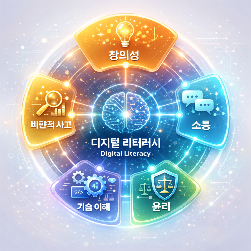 디지털 리터러시는 단순히 기기를 능숙하게 다루는 기술을 의미하지 않습니다. 온라인상의 수많은 정보 중 무엇이 진실인지 파악하는 비판적 사고와, 디지털 도구를 활용해 자신의 아이디어를 구현하는 생산적 능력을 모두 포함합니다.
