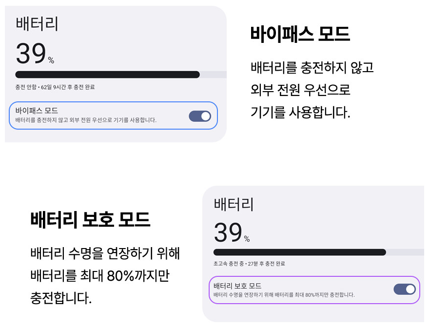 - 바이패스 모드: 충전 없이 기기로 직접 전력 공급 가능